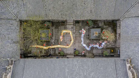 De envelopes a lanternas, o vermelho é a cor dominante, simbolizando sorte e prosperidade. As ruas ganham vida com o ritmo dos tambores enquanto a dança do dragão ocupa o centro do palco. Esta é uma visão panorâmica dos dragões - bonecos alongados adornados com escamas cintilantes e animados por uma equipe de dançarinos.
